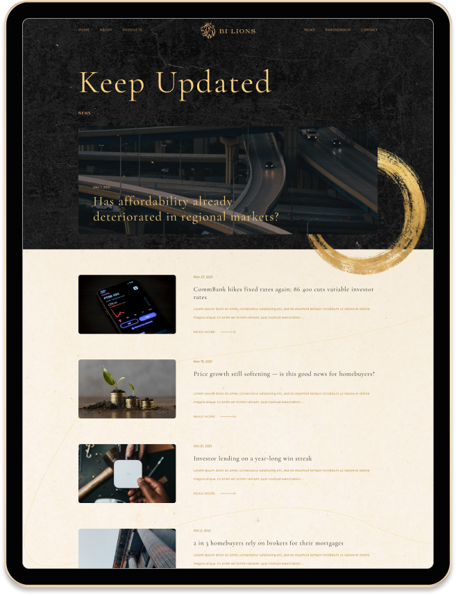 Bi Lions Finance is an Australian-owned, based and regulated non-bank lender and mortgage manager. Inspired by the brand name, we used thick and thin lines and strokes, combined with the founder's initials to create the logo of the lion silhouette, and determined the color tone of black marble and light gold, adding a stable and reliable brand image to the entire design. Strokes of different golden pigments are used throughout the site to match the brand shades.